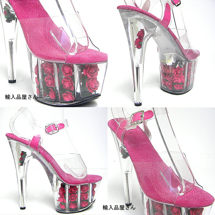 このサンダルの最大の特徴は、厚底とヒール部分に入った可愛いバラです! 中敷とほぼ同じ色のバラが入っていて、アッパーは、クリアのビニル素材に なっています。