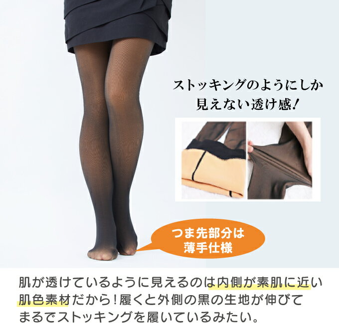 『素肌が透けるようなあったかタイツ M-L/L-LL』タイツ ストッキング風 着圧 あったか 裏起毛 暖かい インナー レディース 商品紹介 特殊な加工で、厚手のタイツを履いているのにまるでストッキングを履いているようなすっきり美脚を演出! しかも内側は毛布のようなふわふわ素材で、スッキリとあったかの両方を兼ね備えたアイテムです。