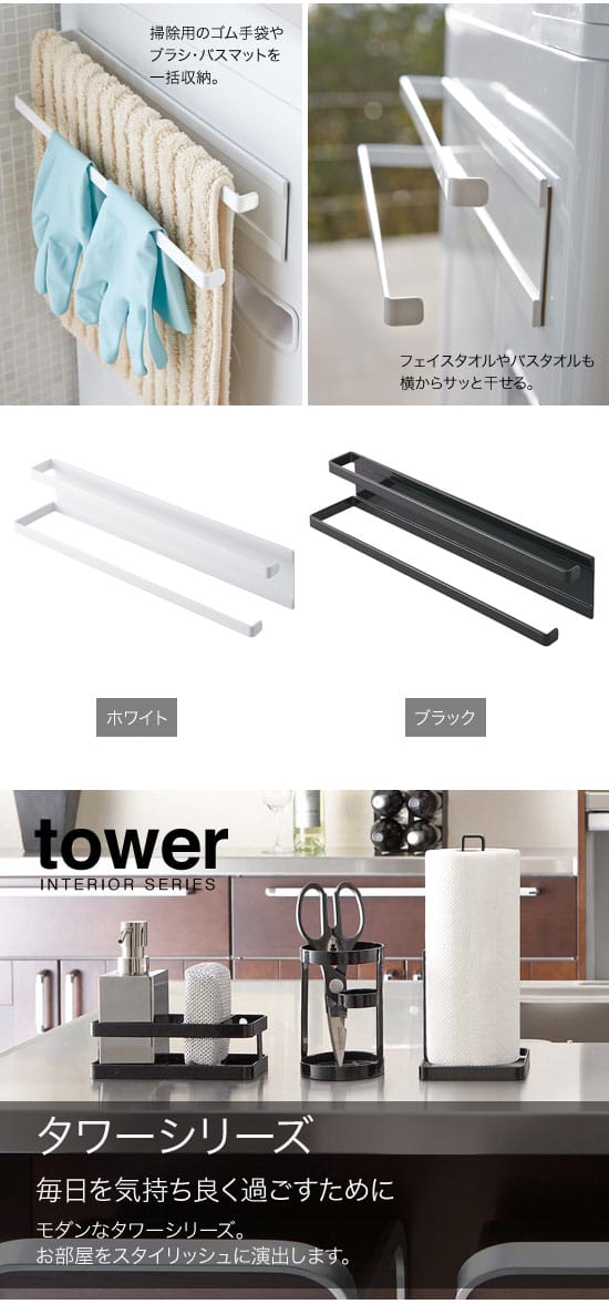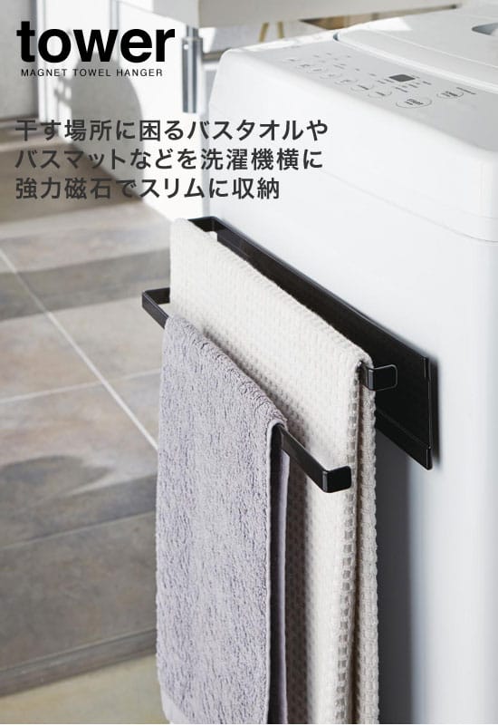 山崎実業 YAMAZAKI tower 洗濯機横マグネットタオルハンガー2段 タワー 干す場所に困るバスタオルやバスマットなどを洗濯機横に強力磁石でスリムに収納♪